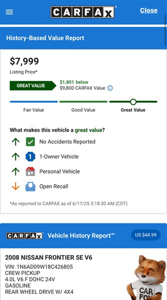 Experience power and reliability with the 2008 Nissan Frontier SE V6. This truck is equipped with a robust 4.0L V6 engine that delivers 261hp and 281ft. lbs. of torque, providing the strength needed for any task. The factory default features include a spacious interior with Steel upholstery, ensuring comfort and durability. The exterior in Storm Gray gives a sleek and modern look to the vehicle. With fuel efficiency in mind, this Frontier gets 14 MPG in the city and 19 MPG on the highway, making it a practical choice for daily driving and long trips. Meticulously maintained, this truck is in excellent overall condition, with a clean CARFAX report and only one previous owner.