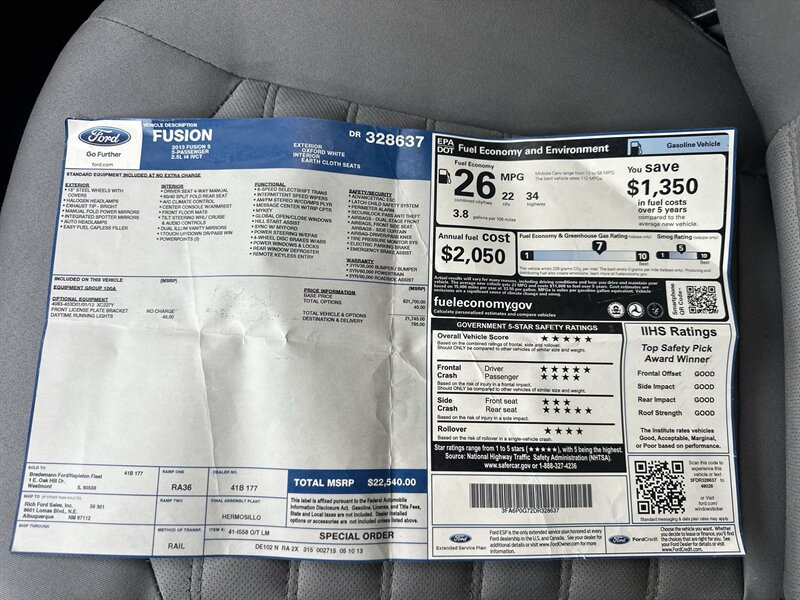 Este Ford Fusion S 2013 está equipado con el motor de fábrica 2.5L de cuatro cilindros en línea que entrega 175 hp y 175 lb-ft de torque, acoplado a una transmisión automática de 6 velocidades para desplazamientos urbanos cómodos y confianza en carretera. El vehículo presenta pintura Sterling Gray Metallic con interior en tela color Earth. Se encuentra en excelente condición general, con un informe CARFAX y menos de 110,000 millas en el odómetro — con un promedio de uso inferior a 8,000 millas por año. El rendimiento de combustible EPA es de 22 MPG en ciudad y 34 MPG en carretera.