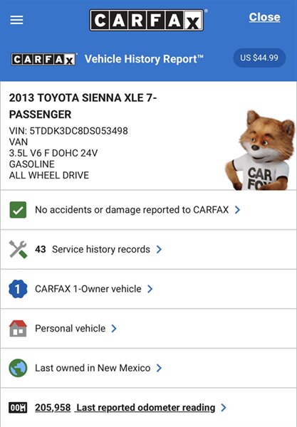 Presentamos una Toyota Sienna XLE 2013 para 7 pasajeros en color Silver Sky Metallic con interior en Gray Claro (Light Gray). Bien mantenida y versátil, esta minivan está equipada con el motor V6 3.5L de Toyota que entrega 266 hp y 245 lb-ft de torque. El XLE ofrece un desempeño confiable y funcionalidad familiar, con un consumo estimado de 16 MPG en ciudad y 23 MPG en carretera. El vehículo se encuentra en excelente estado general, cuenta con un informe CARFAX limpio y ha tenido solo un propietario anterior.