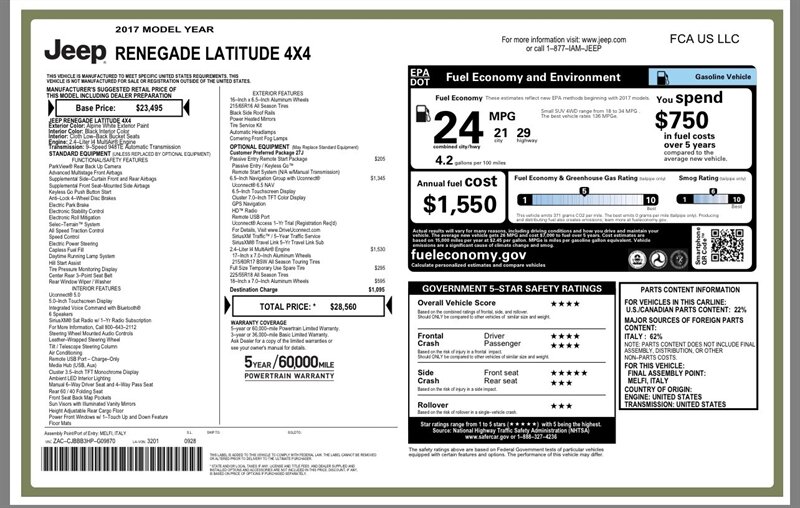 This 2017 Jeep Renegade Latitude is powered by the Tigershark 2.4L I4 engine producing 180 hp and 175 lb-ft of torque, paired with a smooth-shifting 9-speed automatic transmission. It delivers an EPA-estimated 21 MPG city and 29 MPG highway. The vehicle is in excellent overall condition, has CARFAX report and a single prior owner.