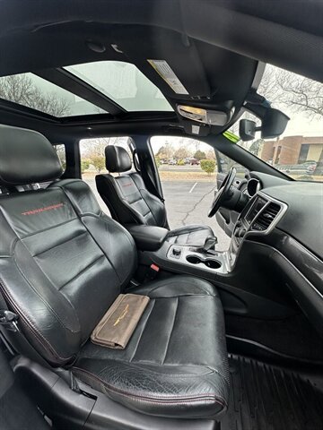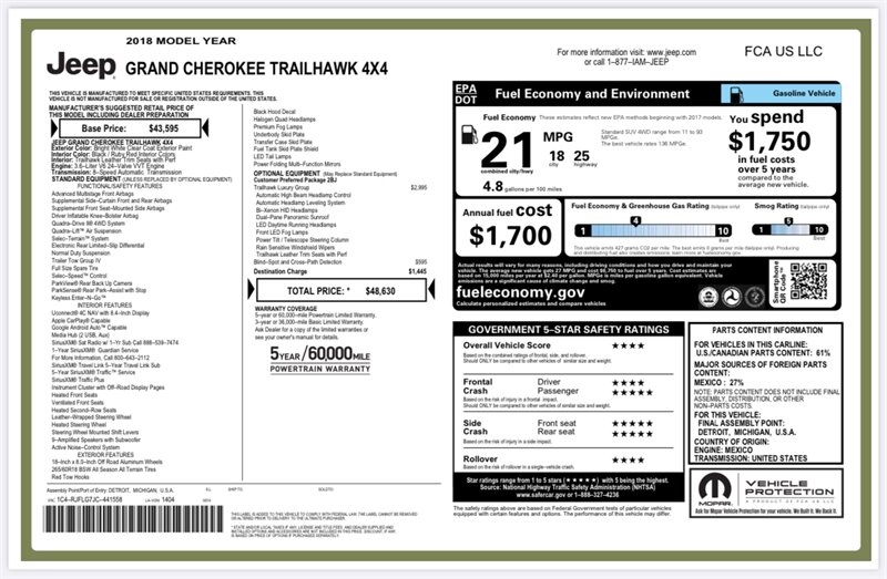 Introducing the 2018 Jeep Grand Cherokee Trailhawk! This SUV is a powerhouse, boasting a Pentastar 3.6L V6 engine that delivers an impressive 295hp and 260ft. lbs. of torque. The exterior is a stunning Bright White Clear Coat, while the interior is a sleek Black/Ruby Red. With 18 MPG in the city and 25 MPG on the highway, this Jeep is both powerful and efficient.