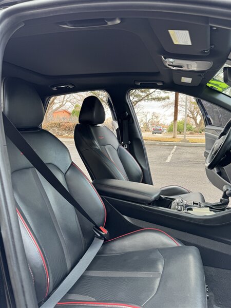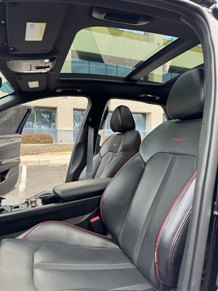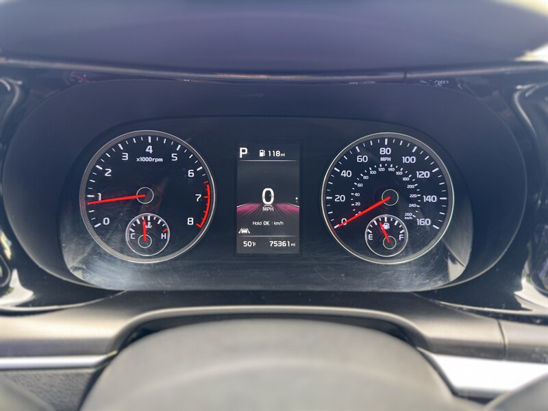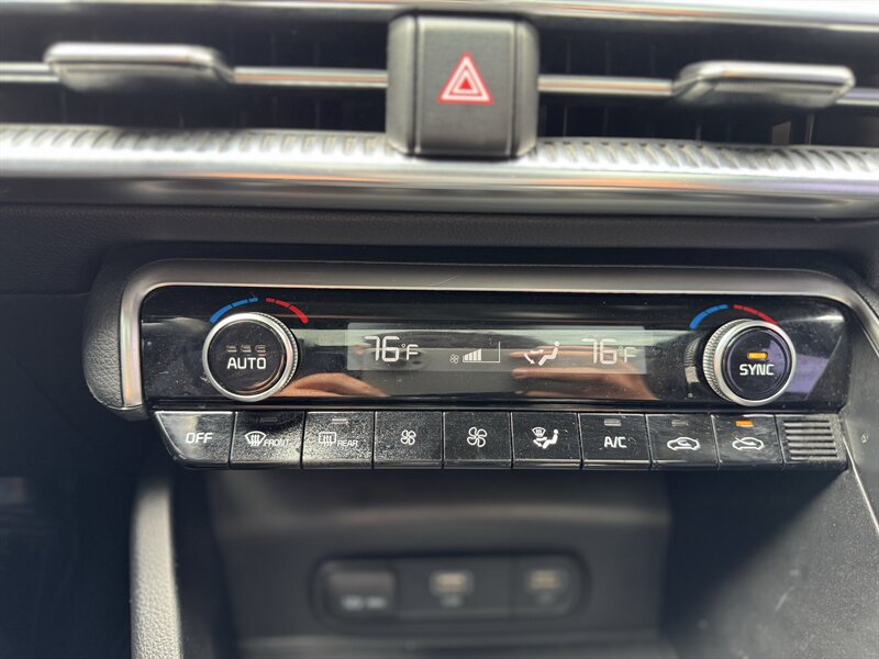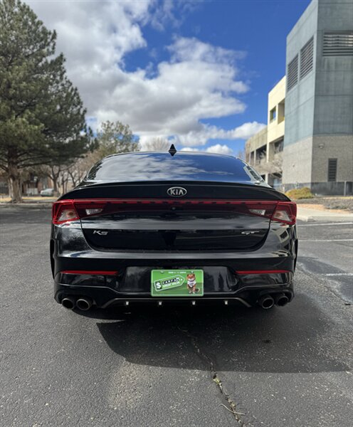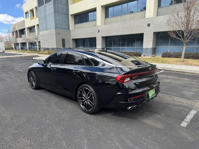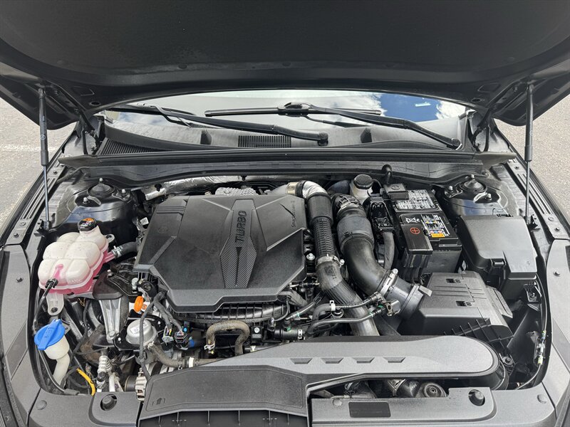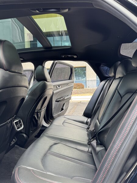Factory-equipped features and highlights: - Powertrain & performance: 2.5L turbocharged I4 engine (290 hp / 311 lb-ft) mated to an 8-speed dual-clutch automatic transmission with manual shift capability and paddle shifters. Sport-tuned suspension and performance-oriented chassis calibration for sharper handling and responsive control. - Exterior: Striking Ebony Black paint with a sport-oriented GT body treatment — aggressive front fascia, sculpted side sills and a performance-style rear bumper with dual exhaust outlets. Factory LED headlights, LED daytime running lights and LED taillights provide modern styling and improved visibility. Factory 19-inch alloy wheels with performance tires complete the look. - Interior & comfort: Black and red sport-trimmed interior with bolstered sport seats and contrast stitching. Leather or leather-like seating surfaces with red accents, a flat-bottom sport steering wheel, and driver-centric instrument layout. Front seats are heated and ventilated; power-adjustable driver seat and supportive front passenger seating enhance comfort on long drives. - Infotainment & connectivity: Factory infotainment system with touchscreen display, smartphone integration via Apple CarPlay and Android Auto, Bluetooth hands-free connectivity, AM/FM/USB inputs, and steering-wheel audio and phone controls. The system includes available navigation and voice recognition functionality. - Convenience: Smart key with push-button start, remote keyless entry, dual-zone automatic climate control, power windows and mirrors, and ample interior storage and cargo capacity for a midsize sedan. - Safety & driver assistance (factory-installed): Comprehensive active safety technologies under Kia’s driver-assist suite, including Forward Collision-Avoidance Assist, Lane Keeping Assist, Blind-Spot Collision Avoidance and Rear Cross-Traffic Alert. Standard passive safety equipment includes multiple airbags, ABS with electronic brakeforce distribution, traction control and electronic stability control. - Condition & record: This vehicle is described as being in excellent overall condition and carries a clean CARFAX report, reflecting a clear history.